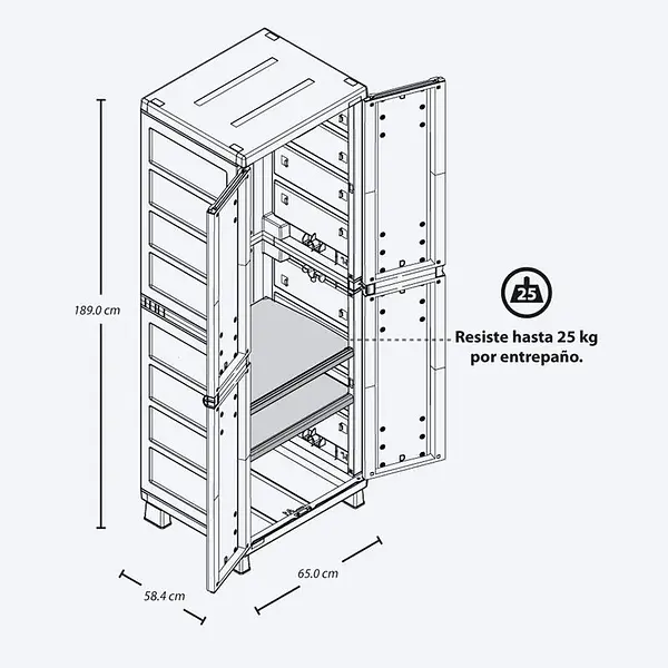 4 entrepaños ajustables que soportan hasta 25 kg cada uno.