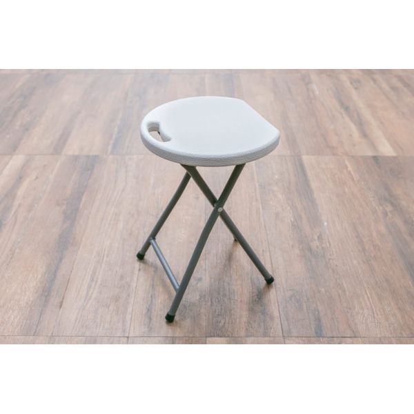 Taburete plegable de resina en color blanco. Con asa de transporte, muy práctico, puedes usarlo también en el exterior de la casa. Soporta hasta 100 kg