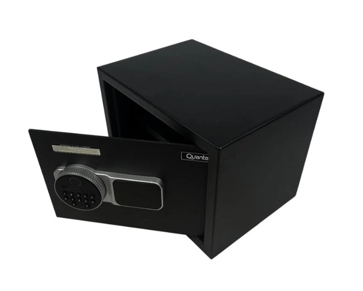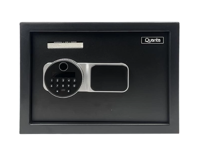 Caja Fuerte Digital Quanta 8.5L con construcción de acero, códigos de hasta 8 dígitos, y almacenamiento de hasta 29 huellas dactilares. Incluye dos llaves tubulares de anulación, conector tipo C para energía externa, y cuatro pilas AAA. Dimensiones: 200x310x200mm. Peso: 4,5 kg. Incluye 2 juegos de tornillos, 2 llaves y 4 pilas AAA.