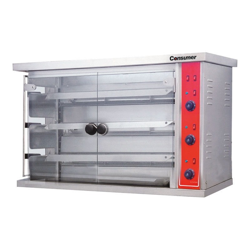 Ventana de vidrio. Temperatura regulable .Cap. 15 Pollos . 3 rodillos Potencia: 6 KW. 380 V. Peso: 4,5 Kg.