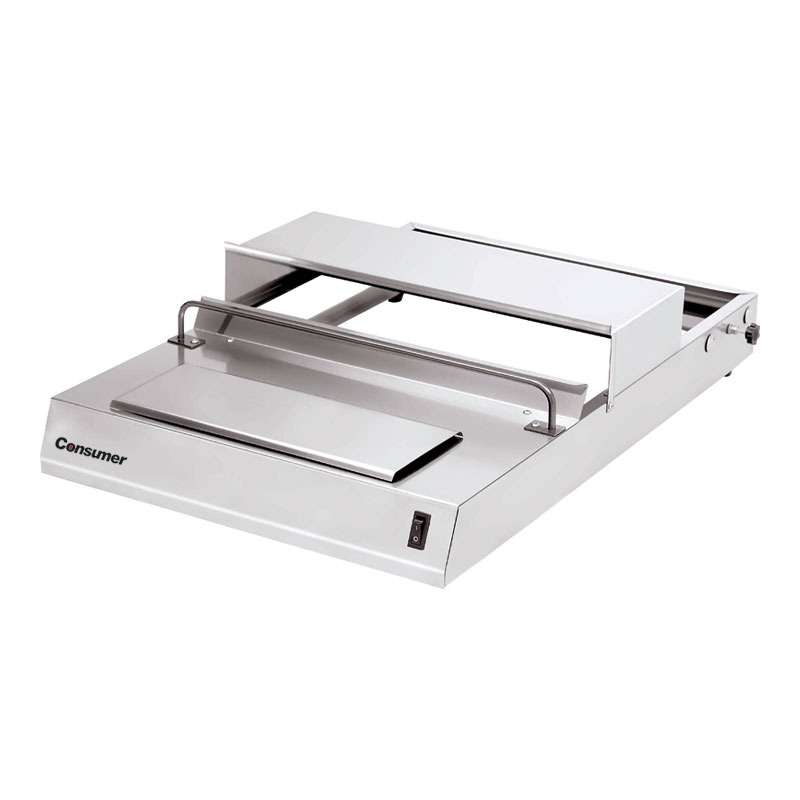 Maquina de embalaje, Material acero inoxidable. sistema de corte por barra, regulador de temperatura de la placa de sellado. Potencia de 0.75Kw. 220v. 50Hz. Peso 5Kg. Medida 550-660-155mm.