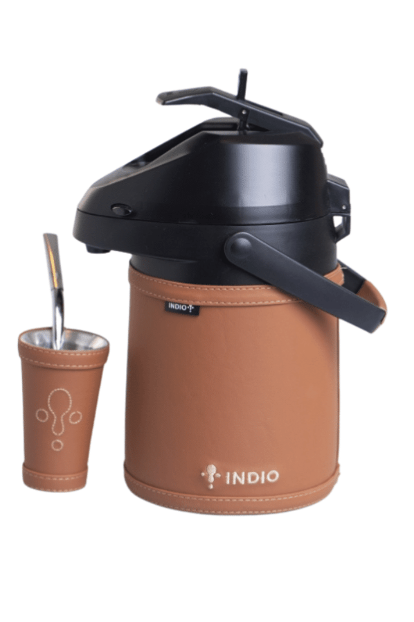 Termo acero inoxidable para agua fría/caliente 2.5 l forrado símil marrón choc. + guampa+bombilla inox 2.5 símil termo indio de 2.5 litros de acero inoxidable de doble pared aislado al vacío forrado y cocido a mano en símil cuero guampa con interior de aluminio, forrada en combinación con el termo. Alto aislamiento térmico, duradero, transportable incluye bombilla de alpaca para terere